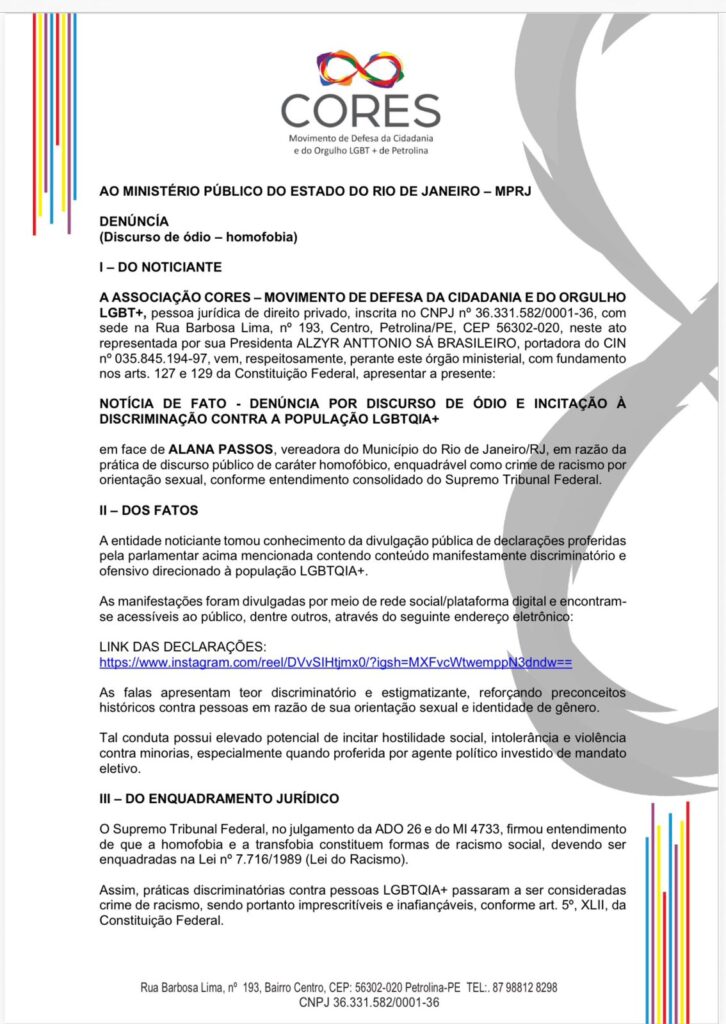OSC CORES protocola denúncia no Ministério Público do RJ por declarações homofóbicas atribuídas à vereadora Alana Passos