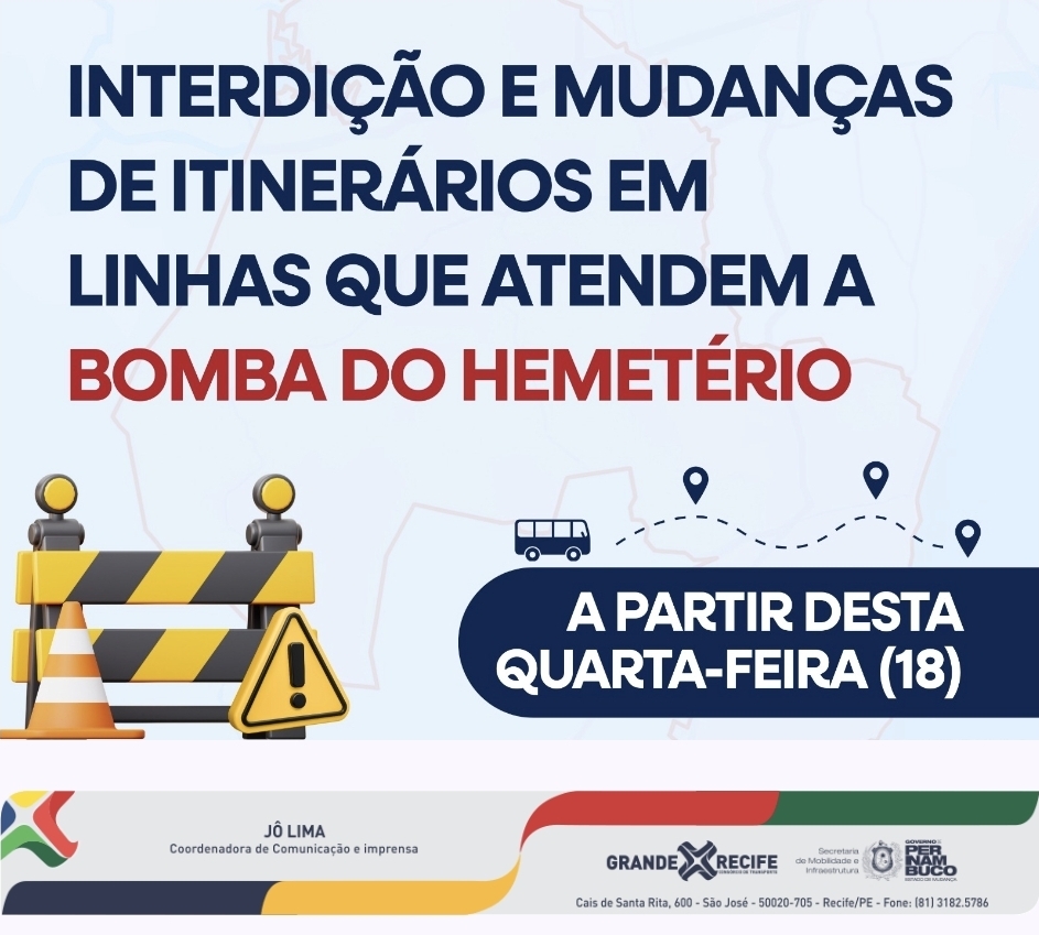 Grande Recife divulga interdição e mudanças de itinerários em linhas que atendem a Bomba do Hemetério