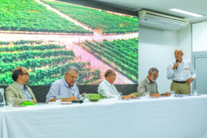 Além de Caviola, participaram da mesa de honra lideranças fundamentais para o setor: Josival Barbosa, presidente do Sindicato dos Produtores Rurais de Juazeiro; Jailson Lira, presidente do Sindicato dos Produtores Rurais de Petrolina; Guilherme Coelho, presidente do Conselho de Administração da Embrapa e ex-presidente da Abrafrutas; e Télio Nobre, reitor da Universidade Federal do Vale do São Francisco (Univasf).