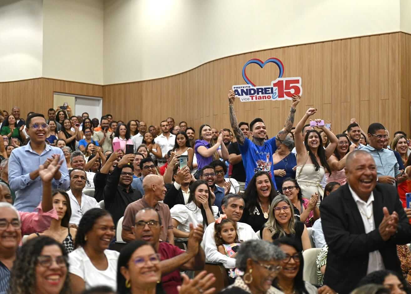 Com o auditório completamente lotado, o evento contou ainda com um telão instalado no hall de entrada, ampliando o alcance da cerimônia para todos os presentes. A solenidade foi marcada pela emoção, reforçada por momentos simbólicos como a entrega da bandeira de Juazeiro por um grupo representando a diversidade da população. A ação rememorou a campanha eleitoral de Andrei, na qual ele percorreu cada canto do município levando a bandeira como símbolo de união e compromisso com os juazeirenses.